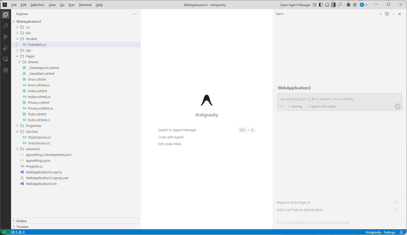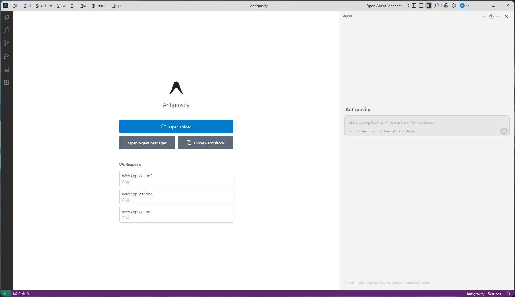 「AntiGravityの画面とは別に」開かれます(色が白黒逆になっていますがご容赦を。。)。