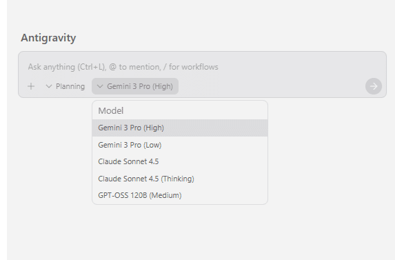 モデルはデフォルトでは以下が選択可能。Gemini3.0 ProのHighとLow、そしてSonnet等が選べます。