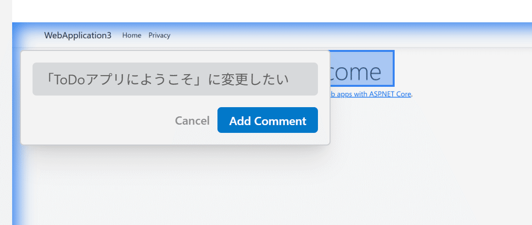 Welcomeの部分をドラッグで囲めるので囲んでみます。すると以下のようにコメントを挿入できますので「ToDoアプリにようこそ」に変更したい、と書いて「Add Comment」ボタンをクリックします。