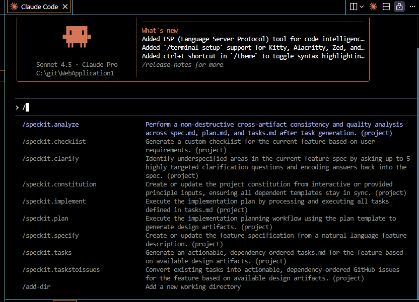 次にスラッシュ「/」を打ち込んで、まずは上記SpecKitのコマンドが表示されることを確認してください。