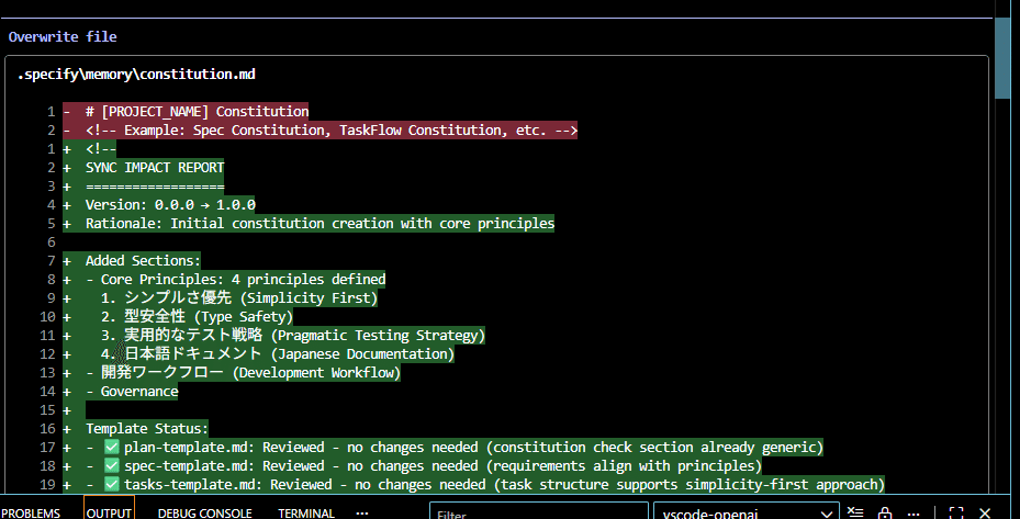 そうするとプロジェクト内の.specify\memoryフォルダにconstitution.mdというファイルがあり、上記指示を盛り込んだ形で更新されます。