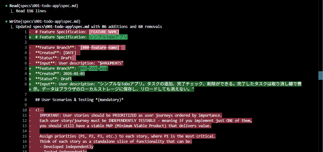 すると仕様が生成され、specs\001-todo-appフォルダ配下のspec.mdが更新されます。