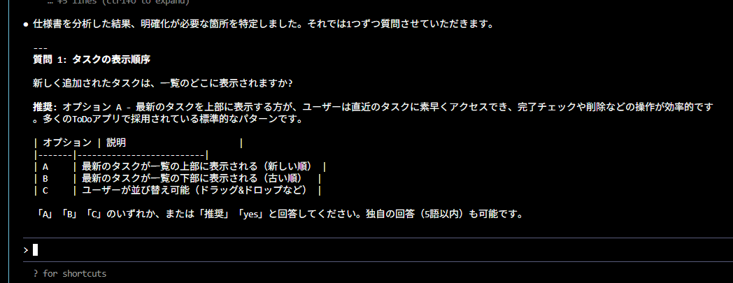 - /speckit.clarify :曖昧な点を質問形式で洗い出す