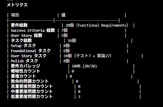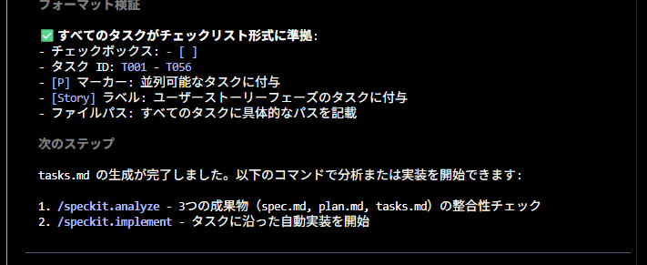 ここでは`tasks.md` が生成されます(ユーザーストーリー単位でタスク化)。