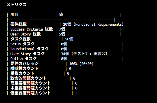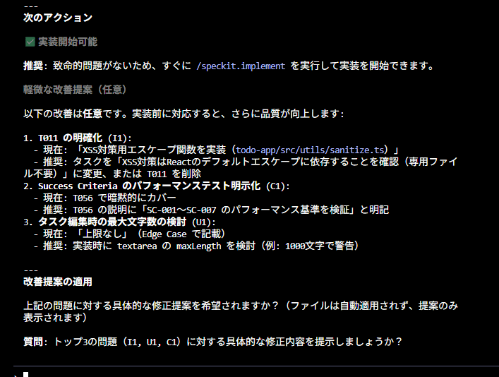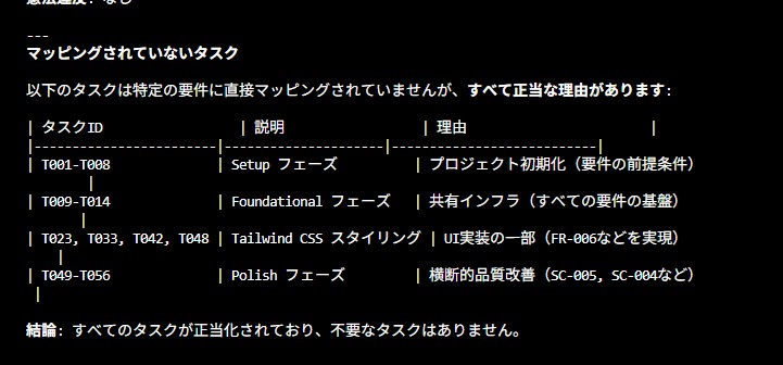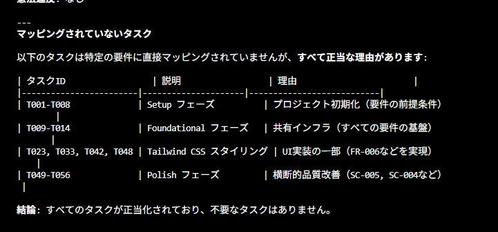 spec、plan、constitution間の整合性をチェックしてくれて、矛盾や抜け漏れがあれば指摘してくれます。