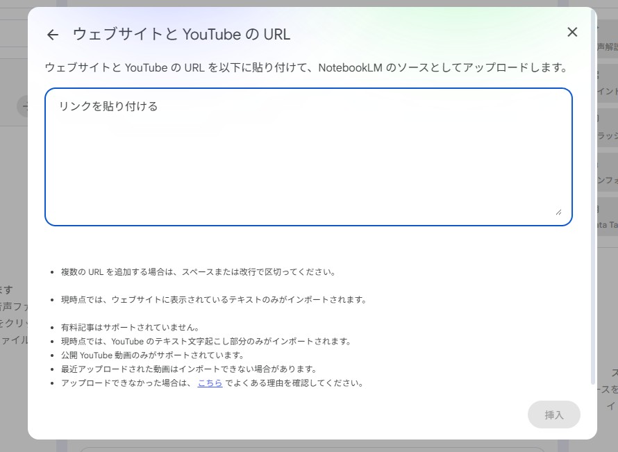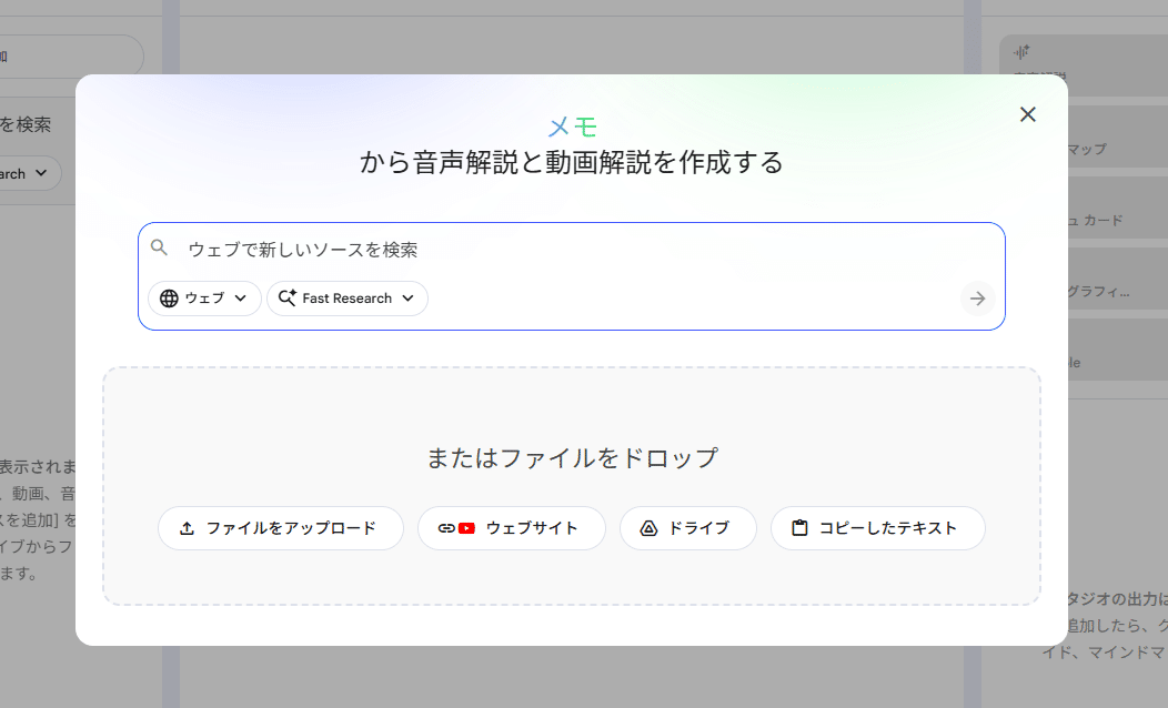 NotebookLMではまずは「ソース」、調べたいこと、まとめたいことについての情報元を設定する必要がありまして、最初に以下のようなダイアログが表示されます。