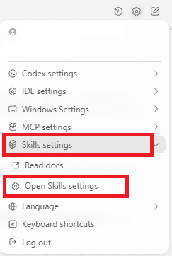 Cursor上のCodexの歯車アイコンをクリックすると以下のようなメニューが出てきますので、「Skills settings」ー>「Open Skills settings」を選択します。