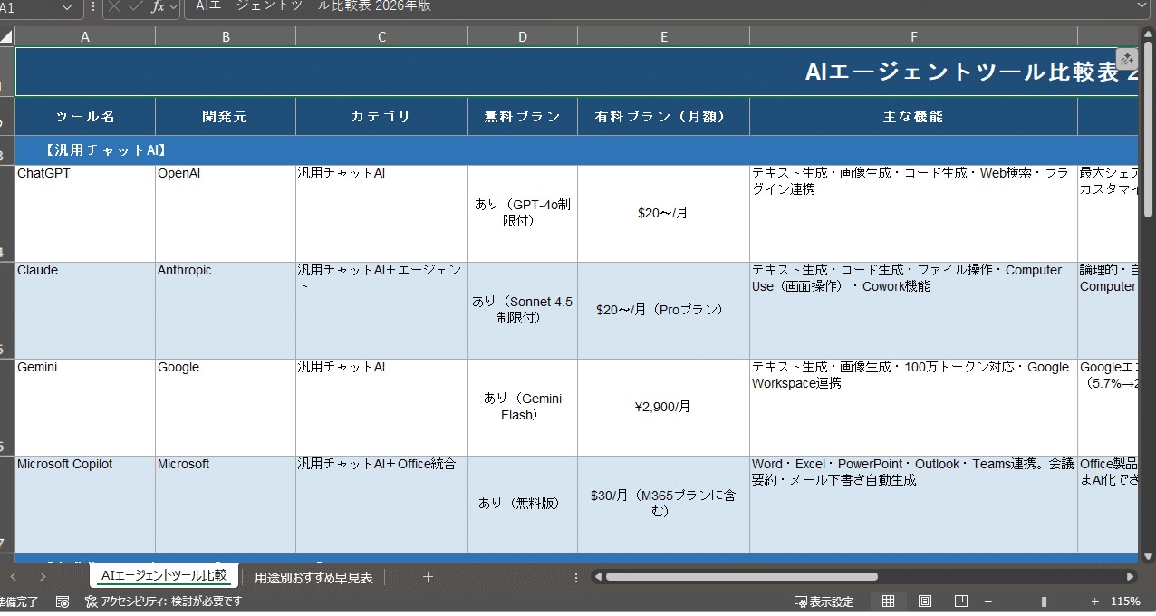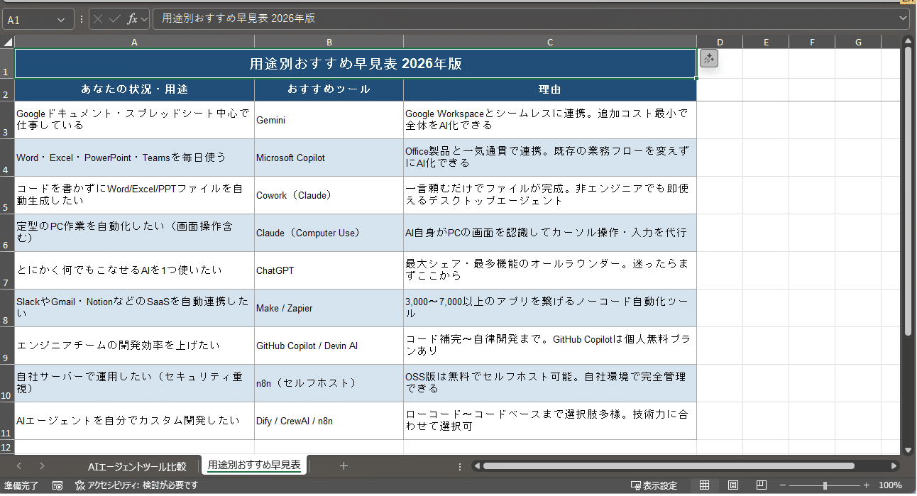 以下が生成されたExcel資料の内容です。「AIエージェントツール比較」シートと、