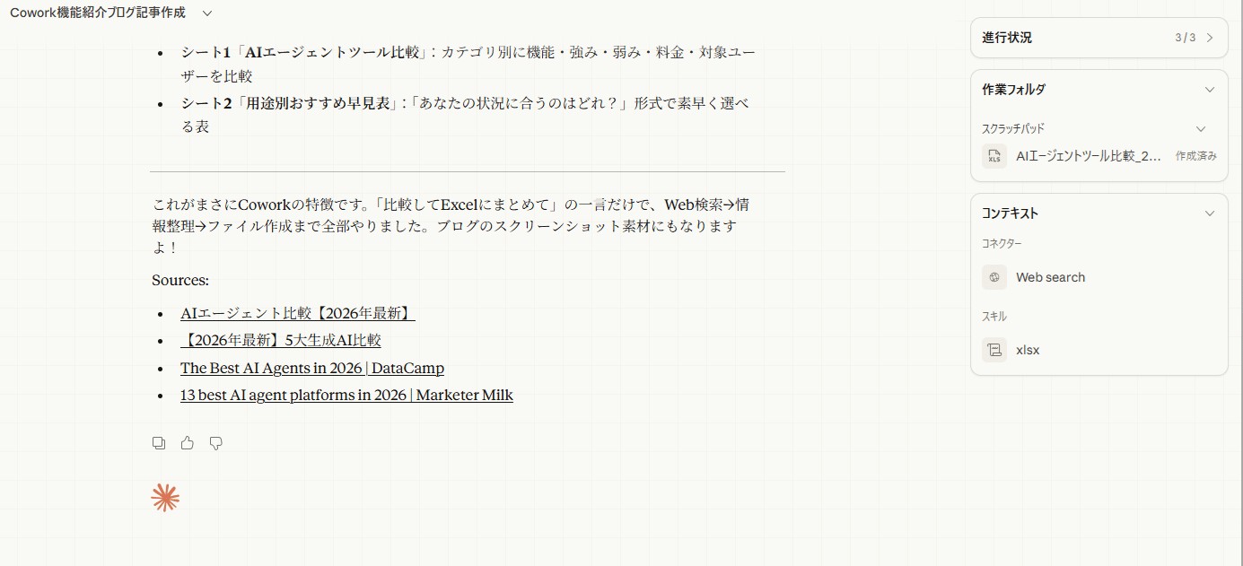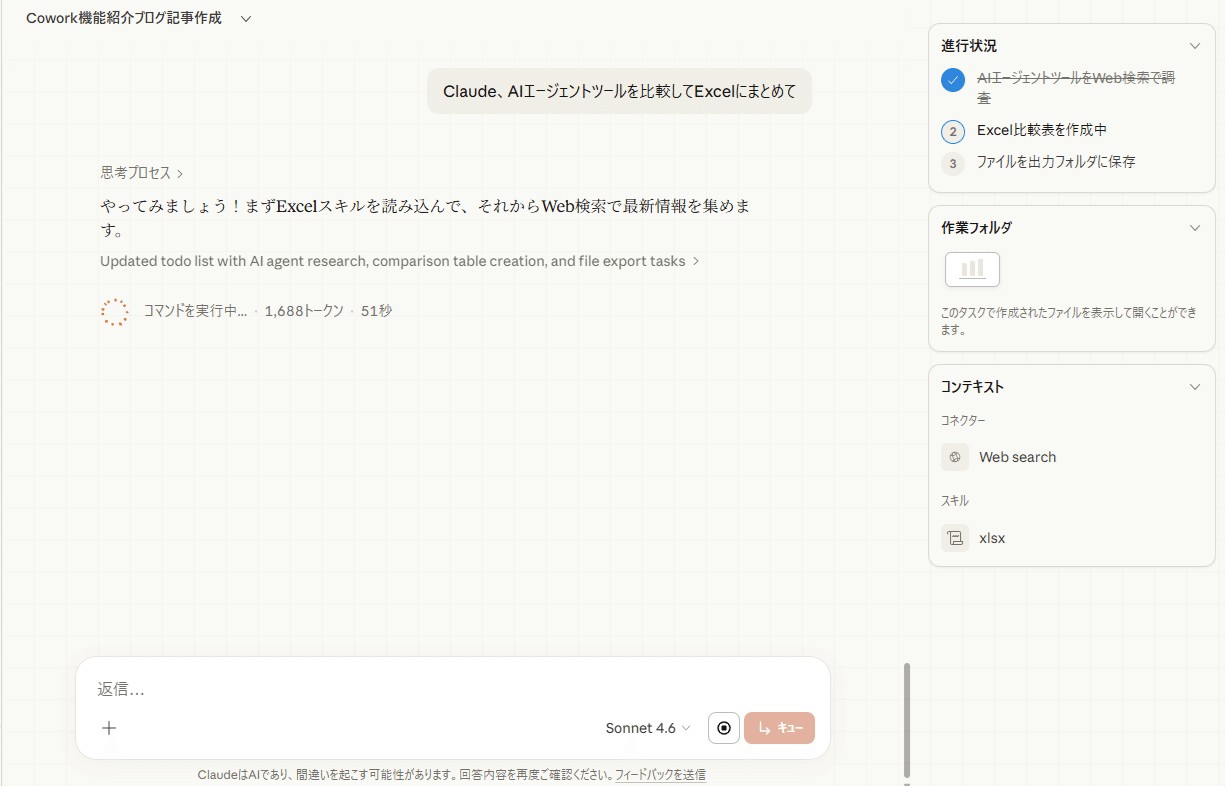 Coworkのチャットで「AIエージェントツールを比較してExcelにまとめて」とお願いしてみます。