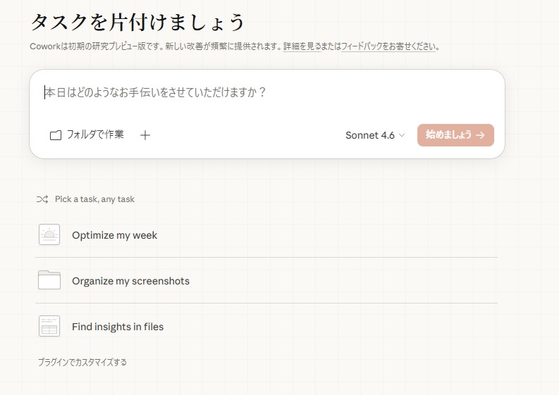 以下がその画面、通常のClaudeの画面と異なりまして、右側に「進捗状況」「作業フォルダ」「コンテキスト」が表示されています。