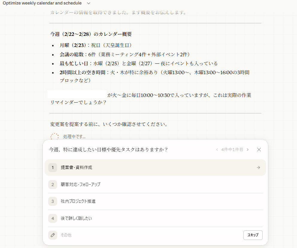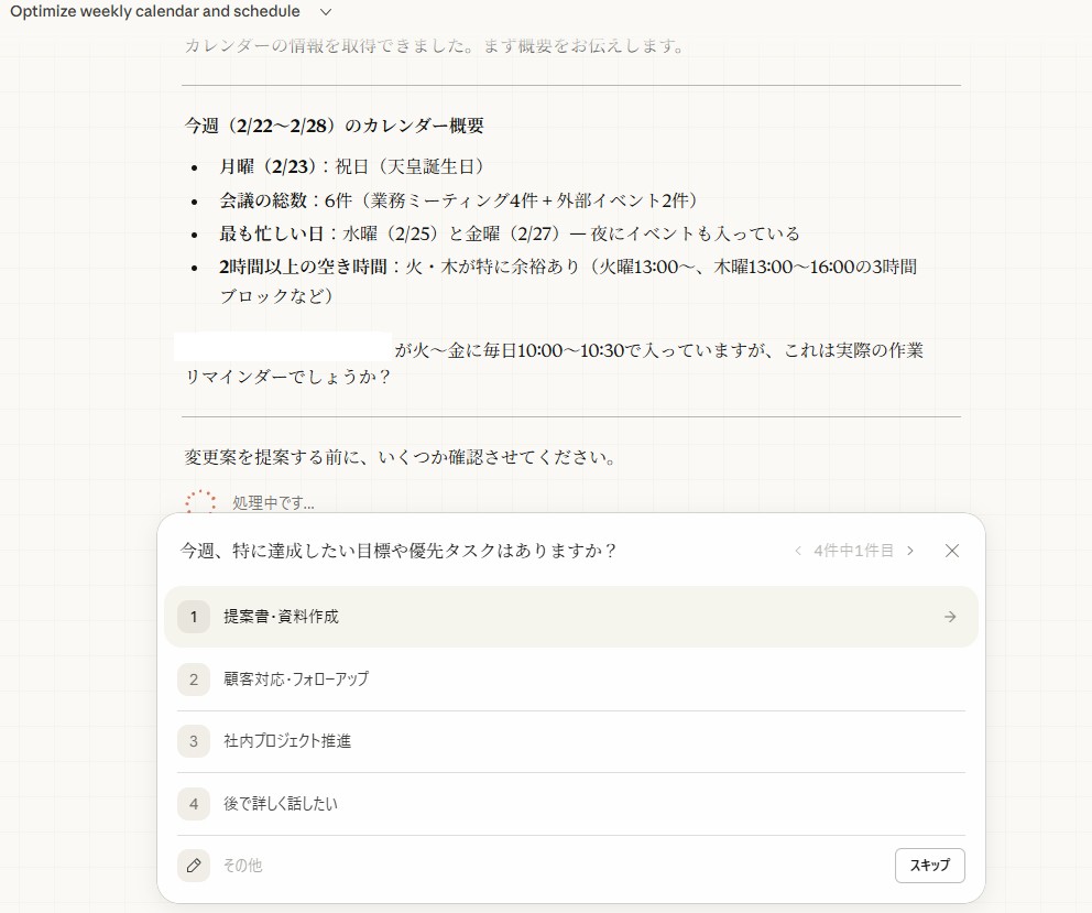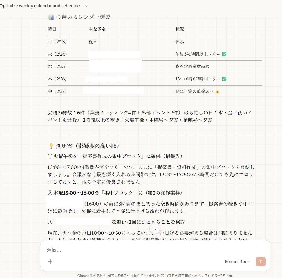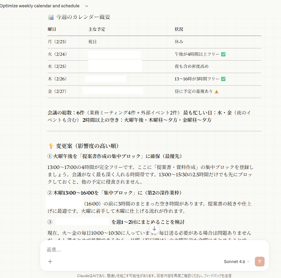 こうして一通り質問に答えると以下のようにスケジュールの内容を分析し、このように変えてみては?という提案をしてくれます。このインタラクティブなやり取りは今までのClaudeのデスクトップアプリでは無かったものでして、非常に寄り添って考えてくれている感があります。