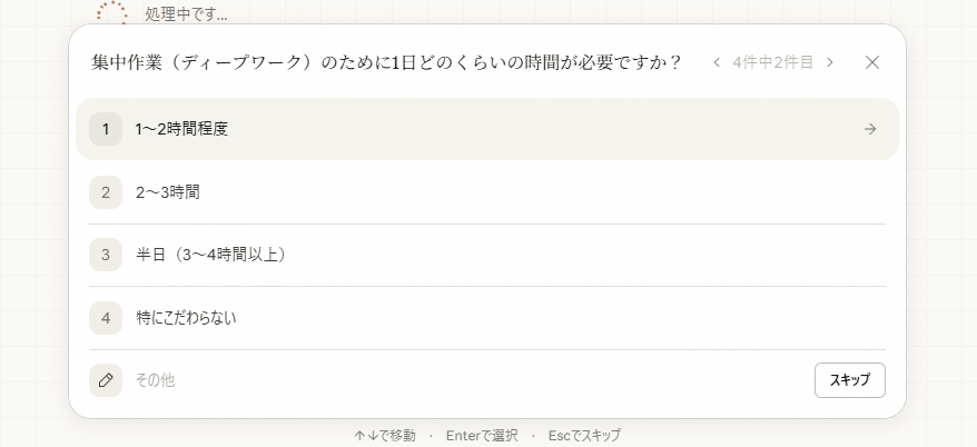 ちょっと興味深かったので今回の質問を一通り載せてみます。次は「集中作業のために1日どのくらいの時間が必要ですか?」
