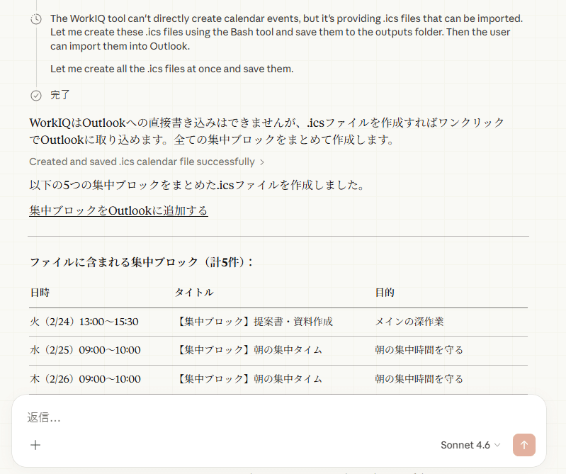 試しに変更を依頼してみましたが、WorkIQでは書き込みができないとのことで、.icsファイルを作成してそれを実行してみてくれと言われます。