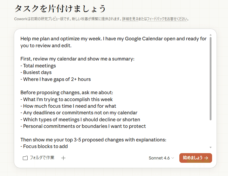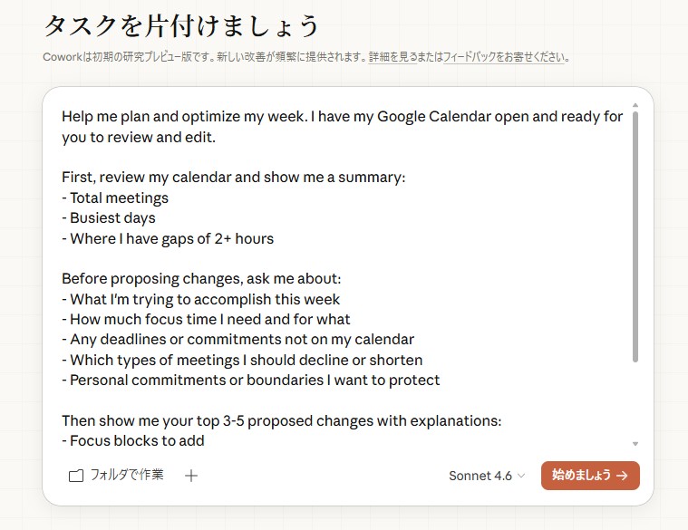 英語なのでちょっとわかりづらいかもですが、内容としては「週の計画と最適化を手伝って」という依頼をClaudeに投げるためのものです。