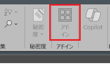 そのあとメニューバーから「ホーム」ー>「アドイン」を選択してください。