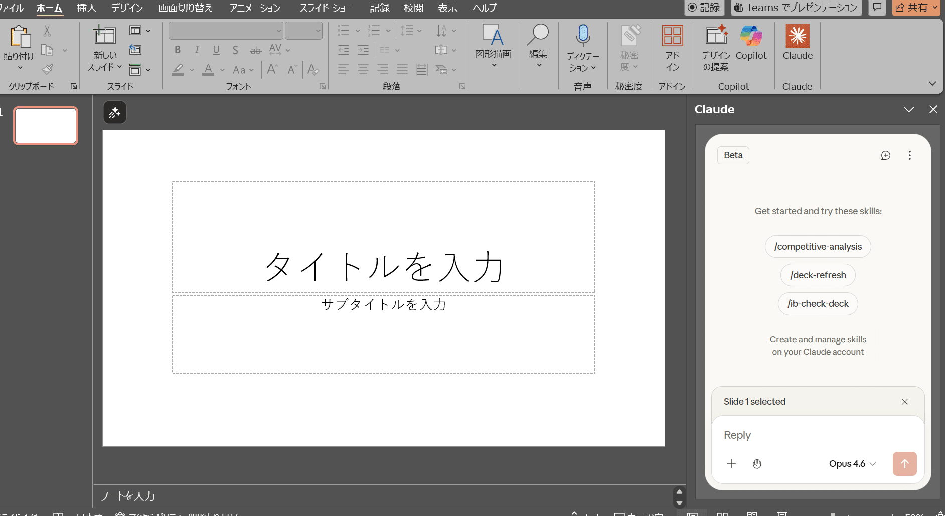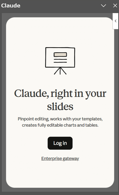 これが今回試してみる「Claude for PowerPoint」になります(2月ごろにこれを扱うブログ等を見ると「Claude in PowerPoint」と書かれているものが多かったのですが、現時点でAnthoropicのサイトを見ると「for」となっていましたので本記事では「Claude for PowerPoint」で進めます)。
