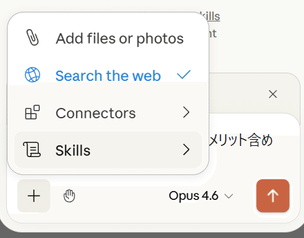 入力欄の「+」アイコンをクリックすると以下のようなメニューが表示されます。ファイルの添付以外にコネクタとスキルも使えるようですね。
