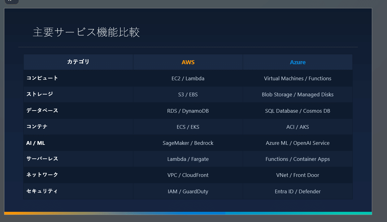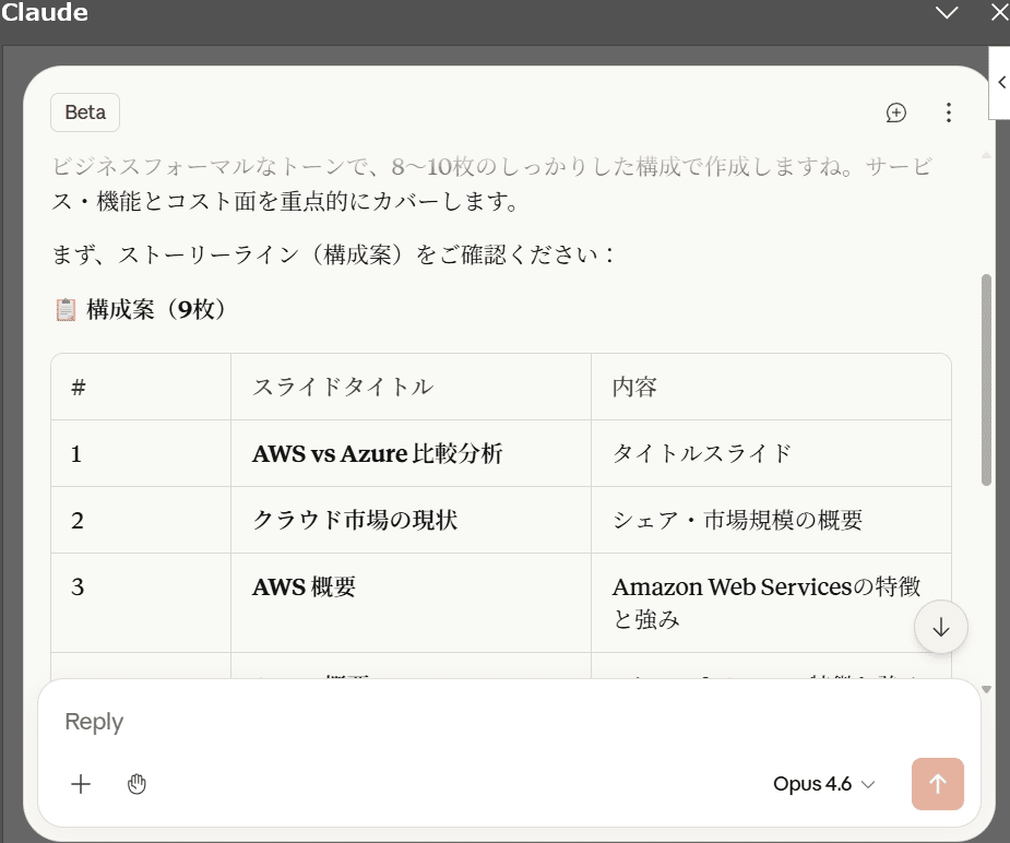 いつもこのOffice系のテストとして試している内容として「AWSとAzureの違いをメリット・デメリット含めまとめてください」というプロンプトがありまして、今回もそれを投げてみます。