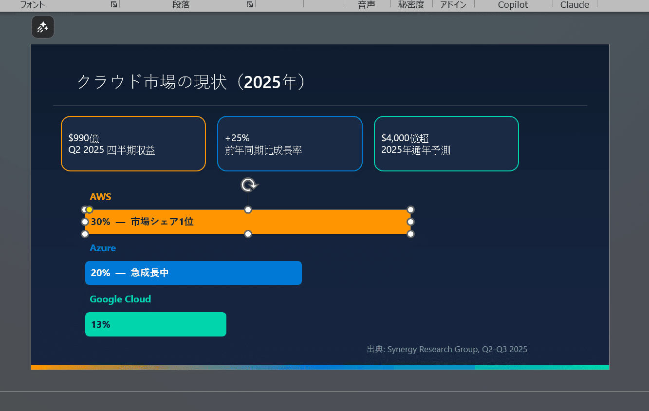 さて、Claudeに限らずAIでファイルを出力すると結構色とりどりな感じで資料が作られるのですが、会社でパワポを使われている方は会社のフォーマットにしたいなと思われるかもしれません。