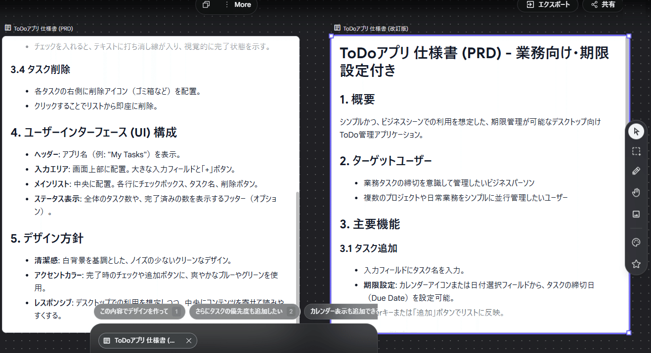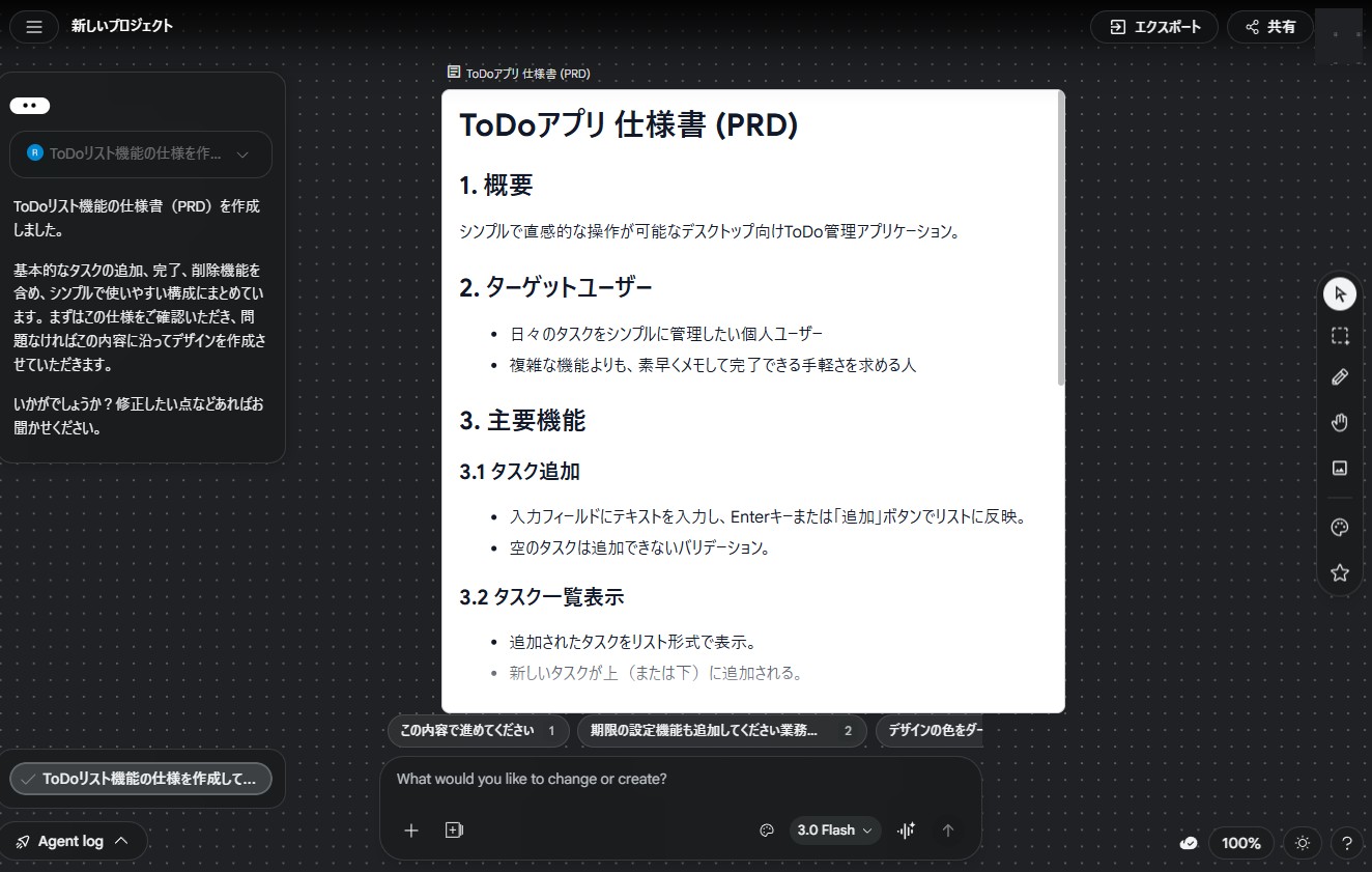 Pencil同様、まずは画面が作成・表示されると思ったのですが、おもむろに「仕様書」が作成されました。