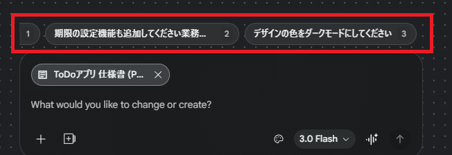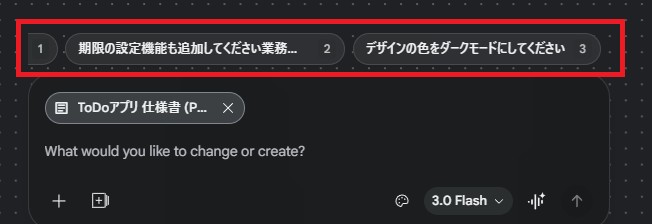 この仕様書の確認を求められると共に、更に修正したい点があるかどうか、その候補も挙げてくれます(以下選択肢が見切れてますが、ドラッグ&ドラッグでスクロールします)。