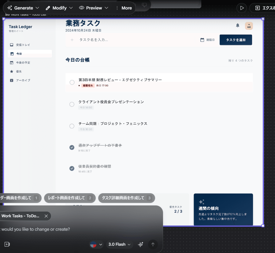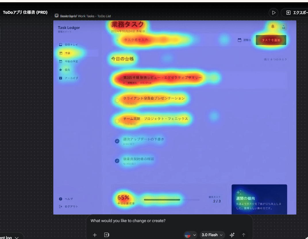 当然プロンプトやプロジェクトによって違いはあるものの、Cursorからいきなり実装を行った場合とは異なり、かなりリッチな印象を受けます。