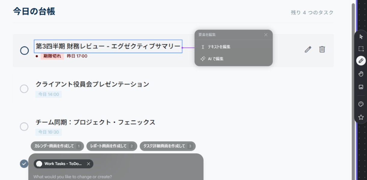 この後のデザイン調整は基本的にプロンプトによって行うことになりますが、文言変更に関しては右側のメニューアイコンから「Direct Edit」を選ぶと以下のように直接テキスト編集を行えます。