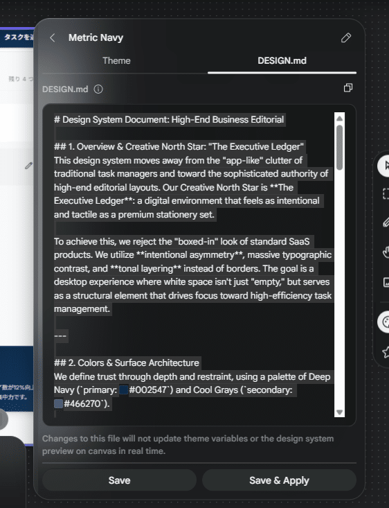 ClaudeにおけるClaude.mdのように、そのデザインのルール(色・フォント等)がMarkdownファイルとして保存されています。
