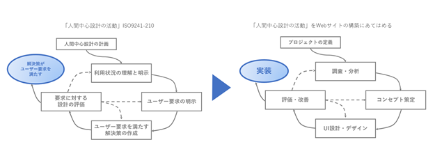 前半の「情報設計を行うために、ユーザーに関するリサーチデータをどのように読み解くべきか」という部分ですが、まずはUX向上のためのプロセスとして重要なのが「人間中心設計の活動」を理解するということでした。そしてそれをWebサイトの構築の言葉で言い換える。いただいた資料の図を摸写すると以下のような感じでした。